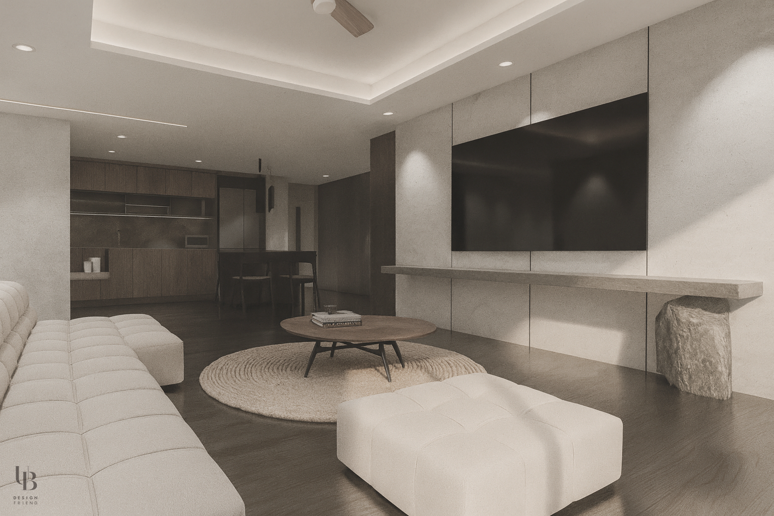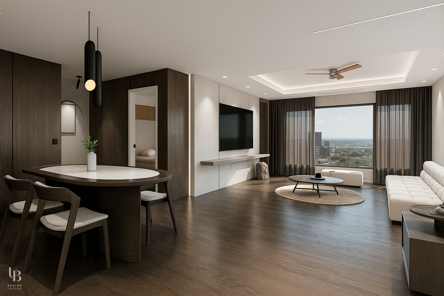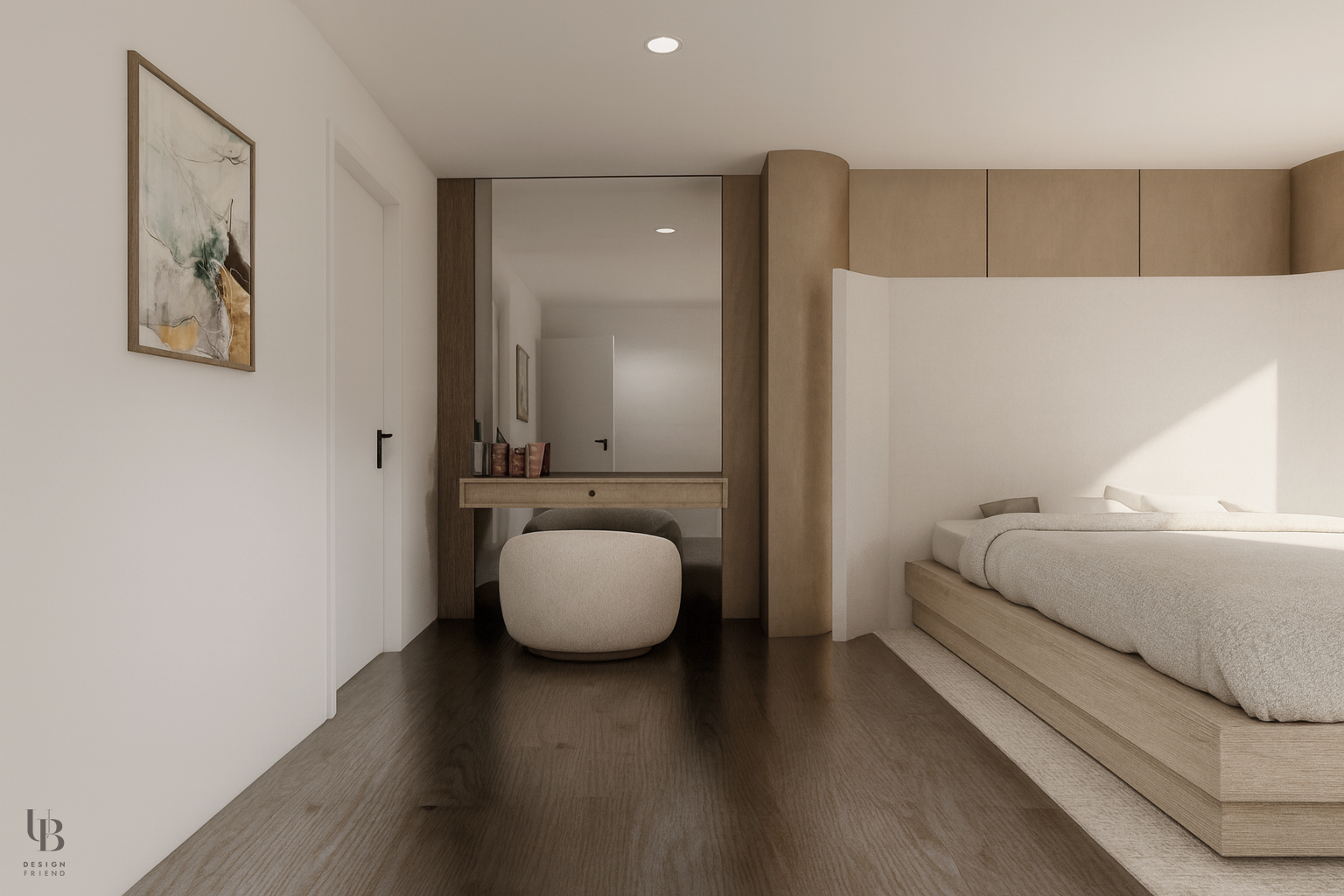 이번 프로젝트는 차분하지만 고급스러운 느낌을 뽐낸 디자인입니다. 거실과 주방 등 공용부의 벽과 바닥 마감재의 색상과 재질을 무겁게 가져가고 침실은 한결 따뜻하고 편안한 느낌을 연출하였습니다.