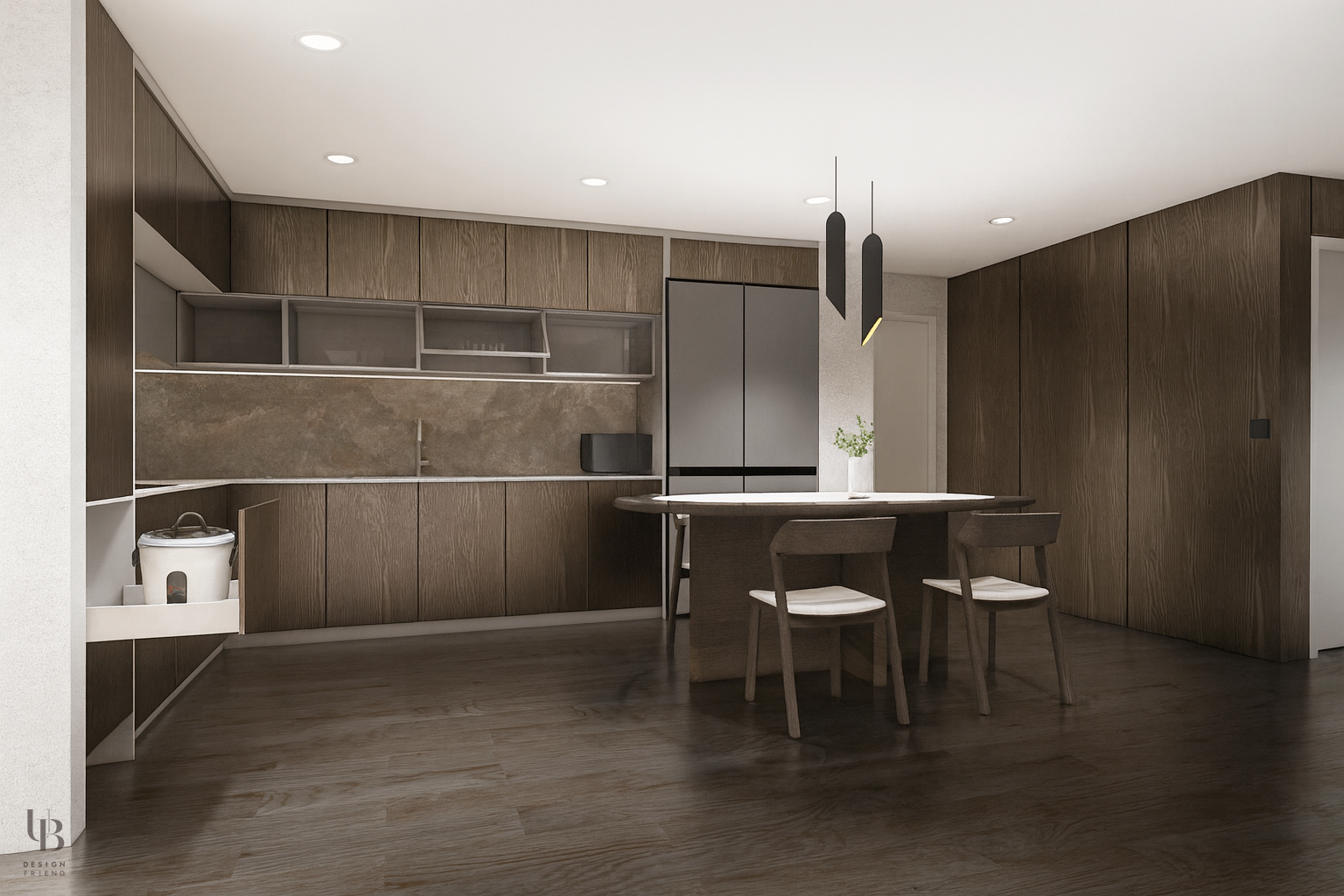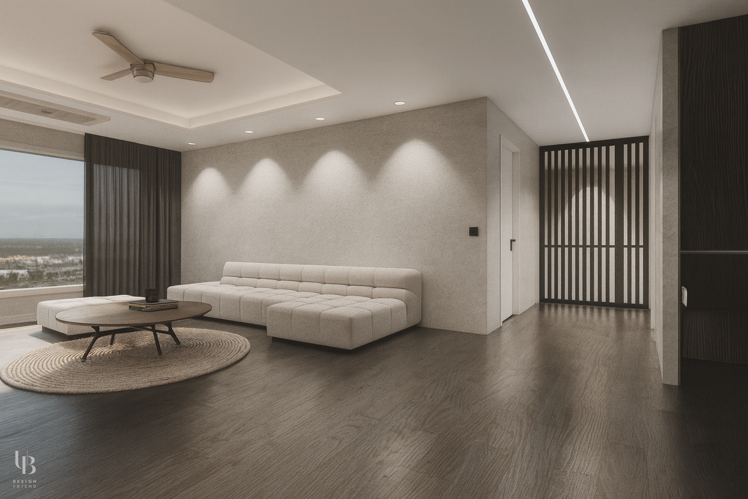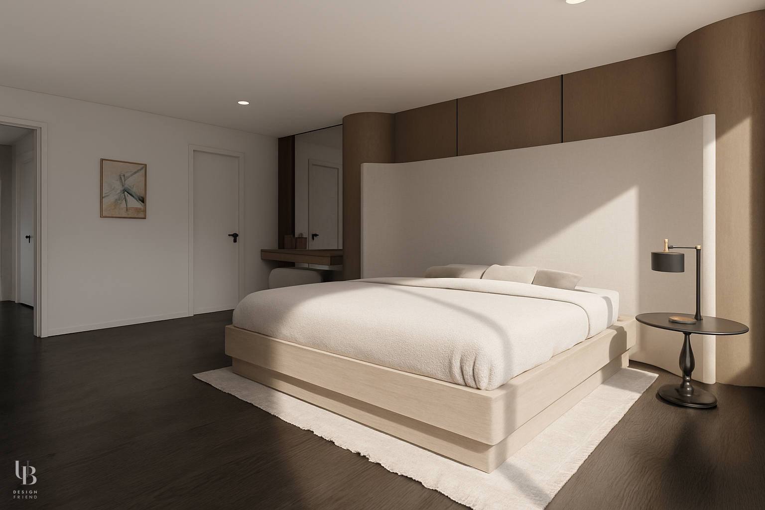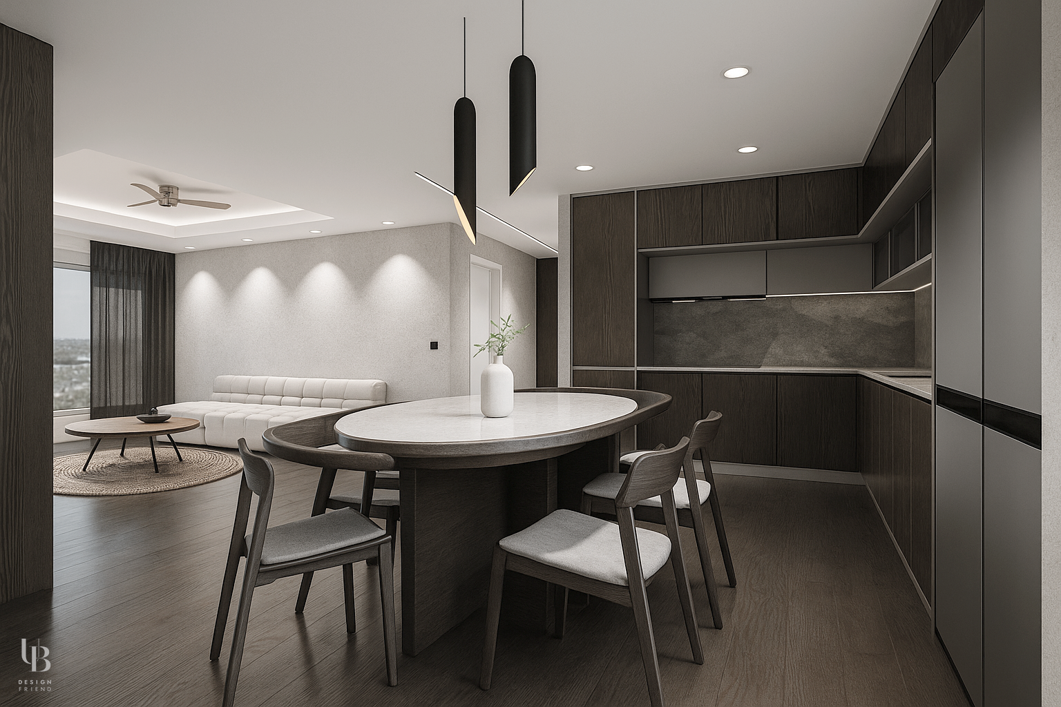 이번 프로젝트는 차분하지만 고급스러운 느낌을 뽐낸 디자인입니다. 거실과 주방 등 공용부의 벽과 바닥 마감재의 색상과 재질을 무겁게 가져가고 침실은 한결 따뜻하고 편안한 느낌을 연출하였습니다.